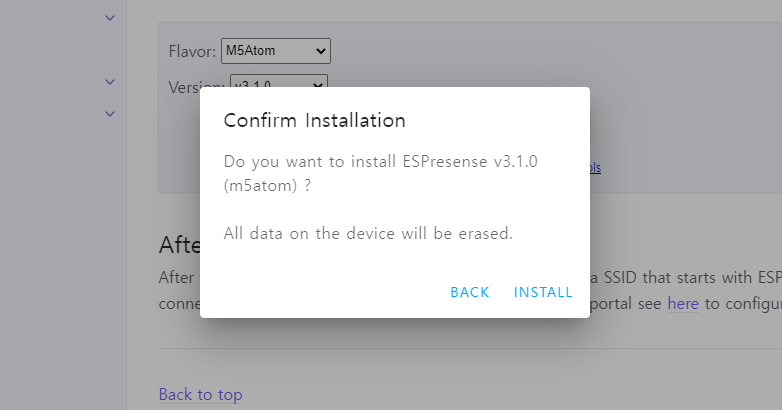 Do you want to erase the device before installing ESPresense v3.1.0 (m5atom)? All data on the device will be lost.