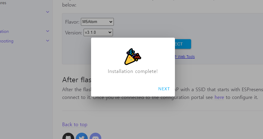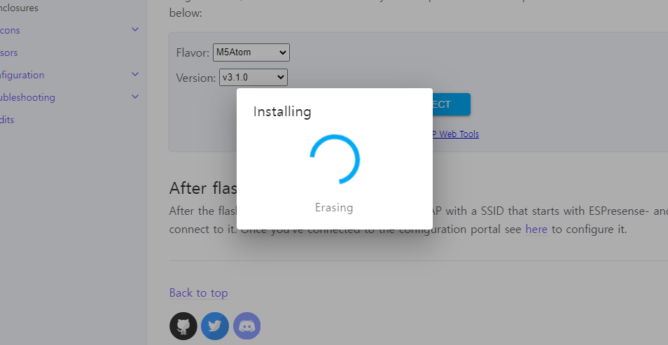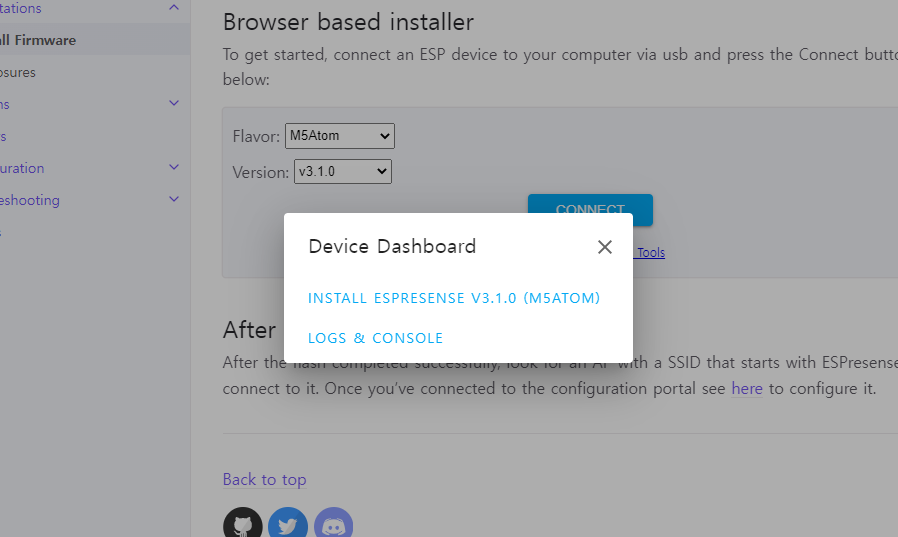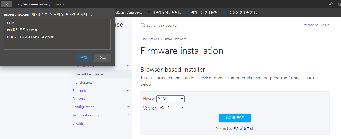ESPresense Install Firmware 페이지로 접속하면 펌웨어를 쉽게 올릴 수 있다.